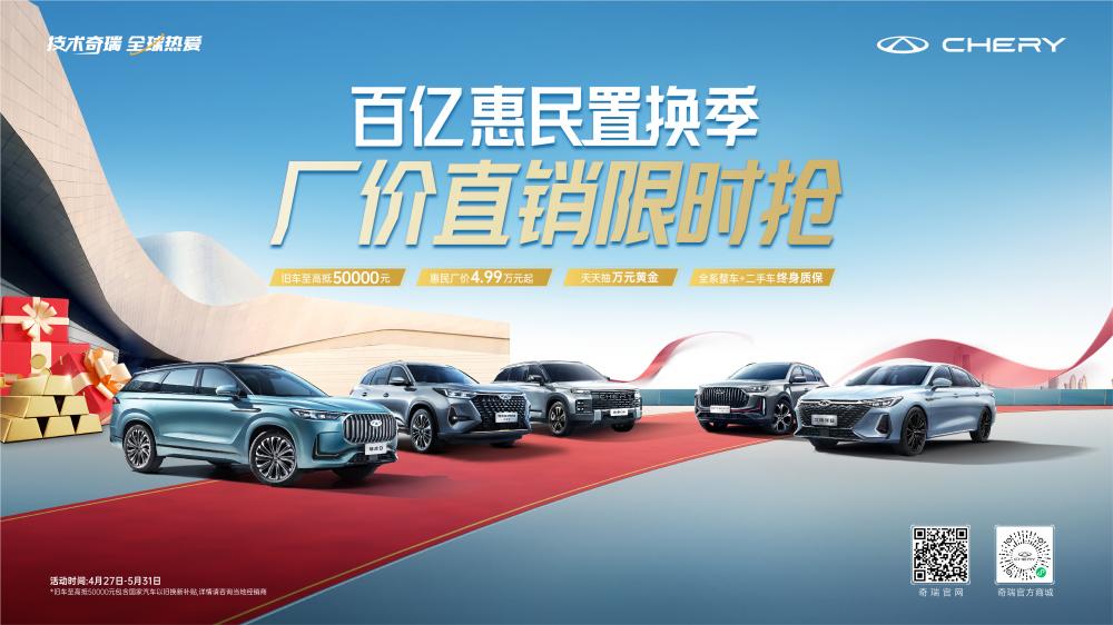 4月27日-5月31日,奇瑞品牌响应国家“以旧换新”补贴政策号召,推出“百亿惠民置换季厂价直销限时抢”活动,旧车不限车况、不限里程、不限年限,至高可抵5万元,更有每天抽万元黄金以及全系整车+二手车终身质保等多重福利,助力广大消费者购买心仪好车。