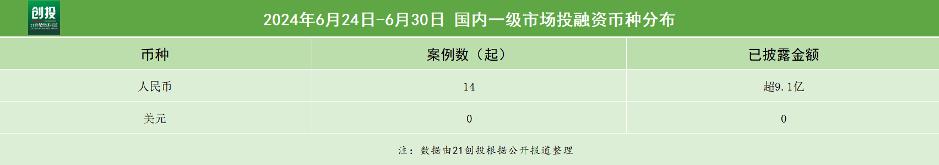 21创投不完全统计,6月24日—6月30日,报告日期内国内一级市场发生融资事件15起。其中,14起融资披露了融资金额和币种信息,总规模超9.1亿元人民币。