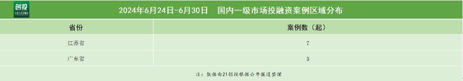 从披露获投企业的地域分布来看,本周的融资地区主要集中在江苏省和广东省,分别完成7笔、3笔融资。
