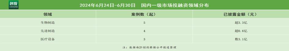 本周,生物制造、医疗设备等细分赛道分别完成5笔、3笔融资,融资金额超7.16亿元人民币,遥遥领先其他赛道。此外,先进制造赛道在本周完成4笔融资。