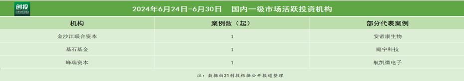 从机构投资活跃度来看,本周金沙江联合资本、基石基金和峰瑞资本较为活跃,各完成1笔融资,主要聚集在科技制造领域。