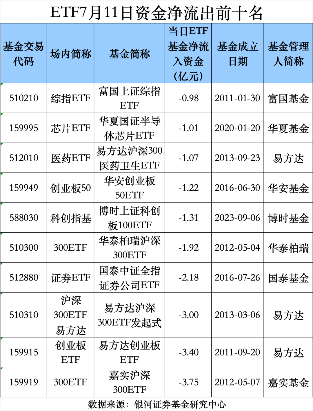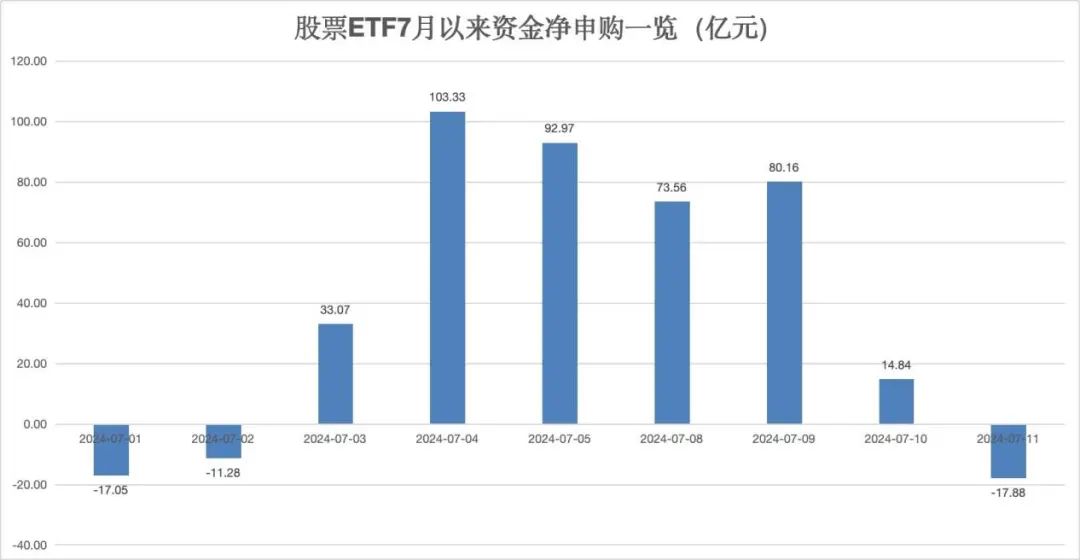 据银河证券基金研究中心数据统计,7月11日,全市场股票ETF(含跨境ETF)全天资金净流出17.88亿元,此前股票ETF连续6个交易日保持资金净流入状态。