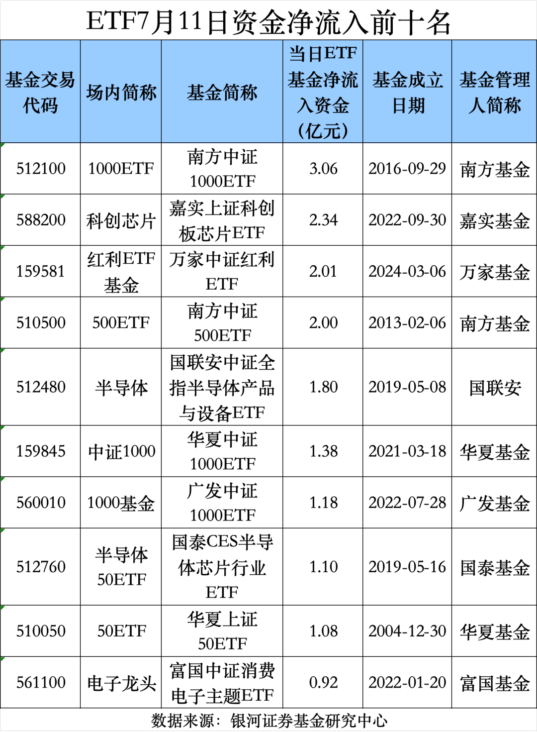银河证券基金研究中心数据显示,7月11日,南方中证1000ETF资金净流入达到3.06亿元,位居全市场ETF榜首,华夏及广发旗下中证1000ETF也有1亿元以上的资金净流入,跻身ETF资金净流入榜前十名。