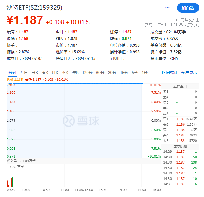 7月17日,南方基金的沙特ETF(159329)和华泰柏瑞基金的沙特ETF(520830)再次涨停,自7月16日上市以来,已连续两个交易日涨停。截至发稿,南方基金的沙特ETF(159329)最新价格报1.187元,成交金额达7.37亿元,溢价率达15.69%。