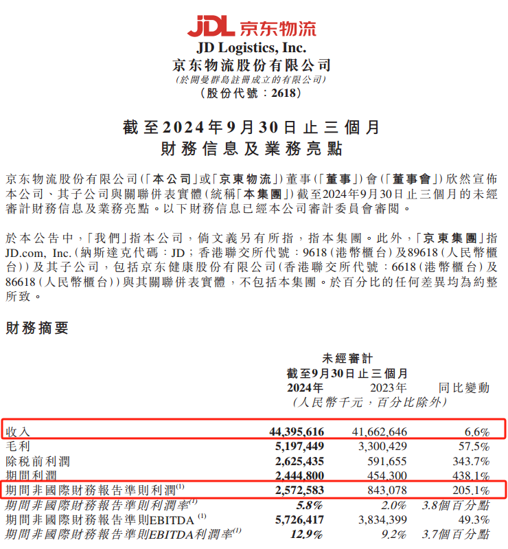 11月14日,京东物流(HK2618)发布业绩报告显示,2024年第三季度非国际财务报告准则利润为25.73亿元,同比增长205.1%。