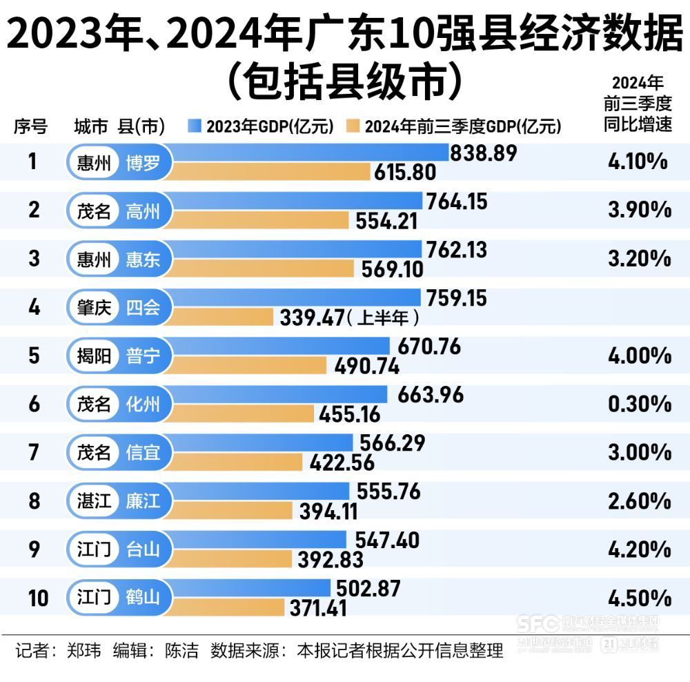 2024年上半年,广东全省57个县(市)实现GDP共7756.57亿元,其中32个县(市)增速高于广东全省平均水平。2024年前三季度,广东十强县中,有4县(市)GDP增速超4%。