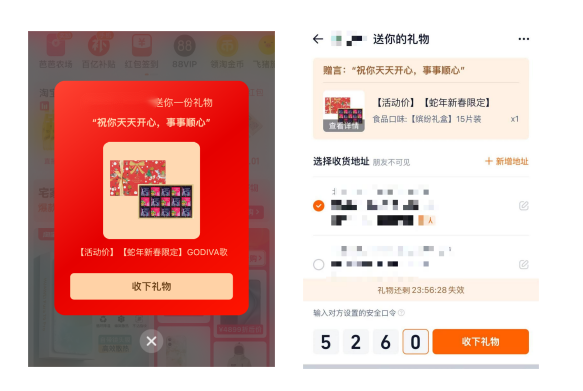 收礼物的用户,通过复制链接到淘宝App便可以看到礼物信息,点击“收下礼物”,再填写收货地址和安全口令,就可以收下礼物。