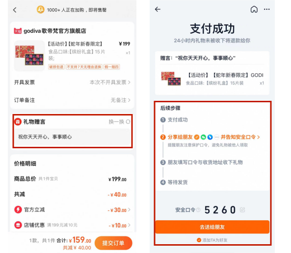 值得注意的是,礼物领取在24小时内有效,超时会自动失效。目前该功能不支持多个商品合并送礼,且送礼方下单后暂无取消订单或退款通道。
