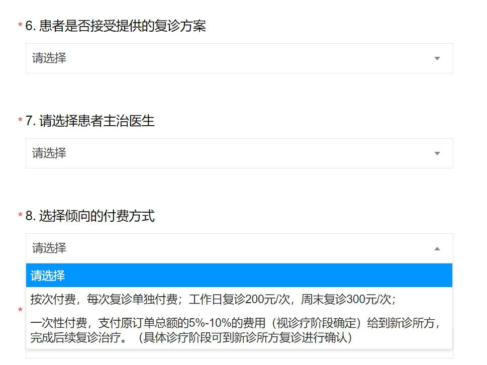 2月13日,一份汉中路店患者复诊接受意向及联系方式收集表出现,提供了三种复诊收费方式供患者选择。