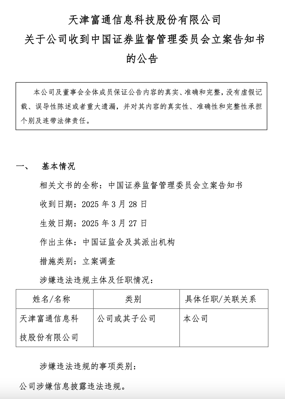 3月28日晚间,退市公司天津富通信息科技股份有限公司(简称“天通5”或“富通信息”)发布公告称,公司收到证监会立案调查告知书。因公司涉嫌信息披露违法违规,3月27日,证监会决定对公司立案。