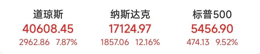 当地时间4月9日,美股三大指数集体暴涨,截至收盘,道指涨2962.86点,涨幅为7.87%,报40608.45点;纳指涨1857.06点,涨幅为12.16%,报17124.97点;标普500指数涨474.13点,涨幅为9.52%,报5456.90点。
