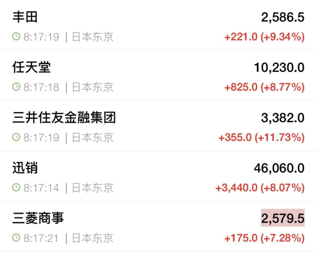 三井住友金融集团涨超11%,丰田、任天堂、三菱商事均涨超7%。