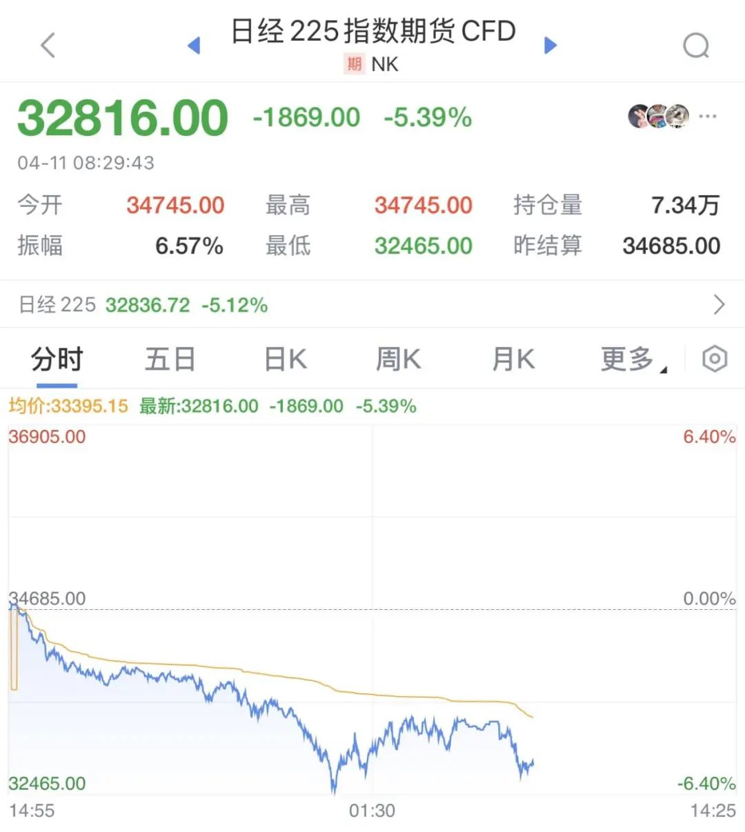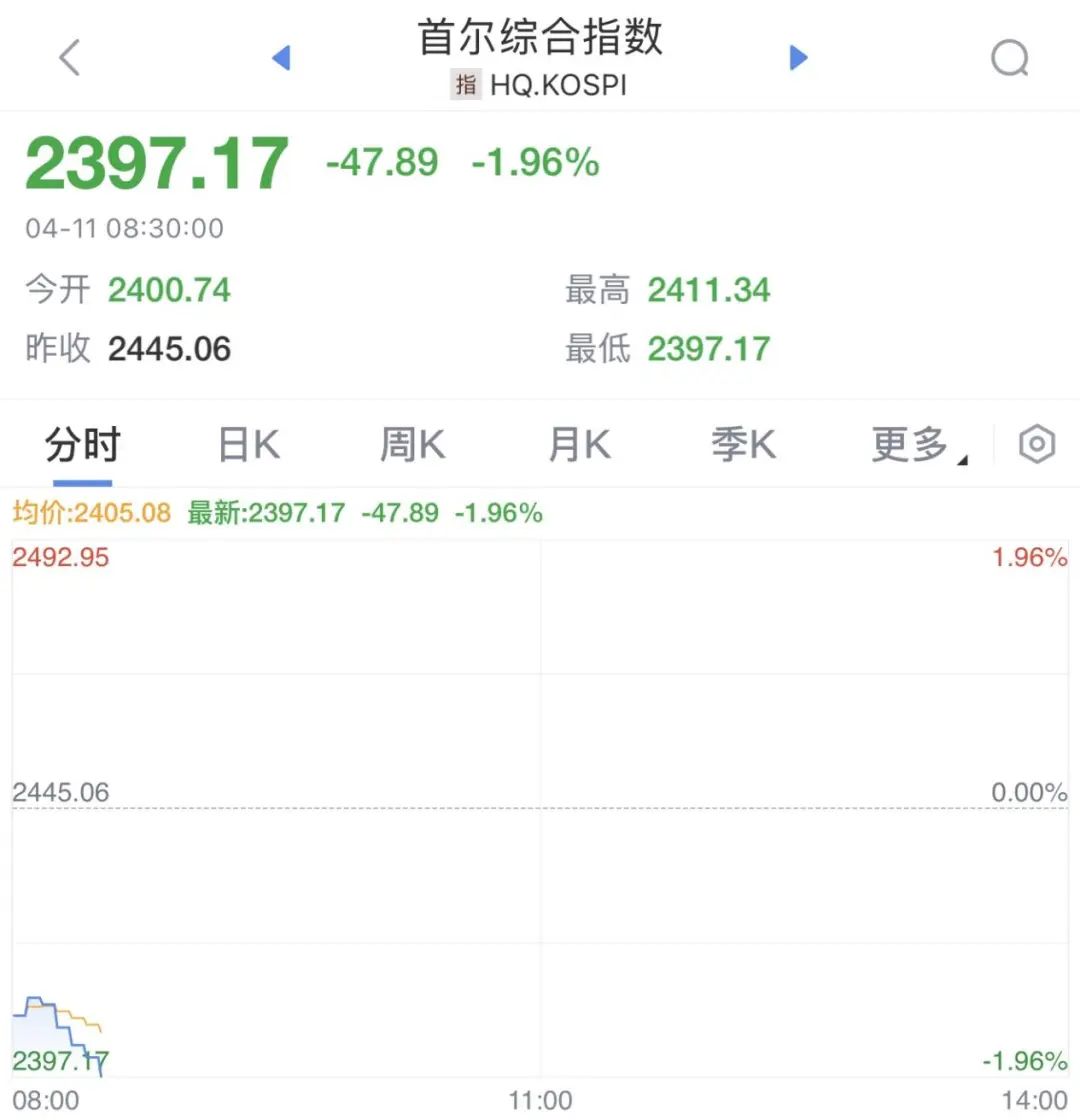 4月11日,日韩股市双双低开,日经225指数开盘快速下探,一度下跌近2000点,跌幅扩大至5.66%。