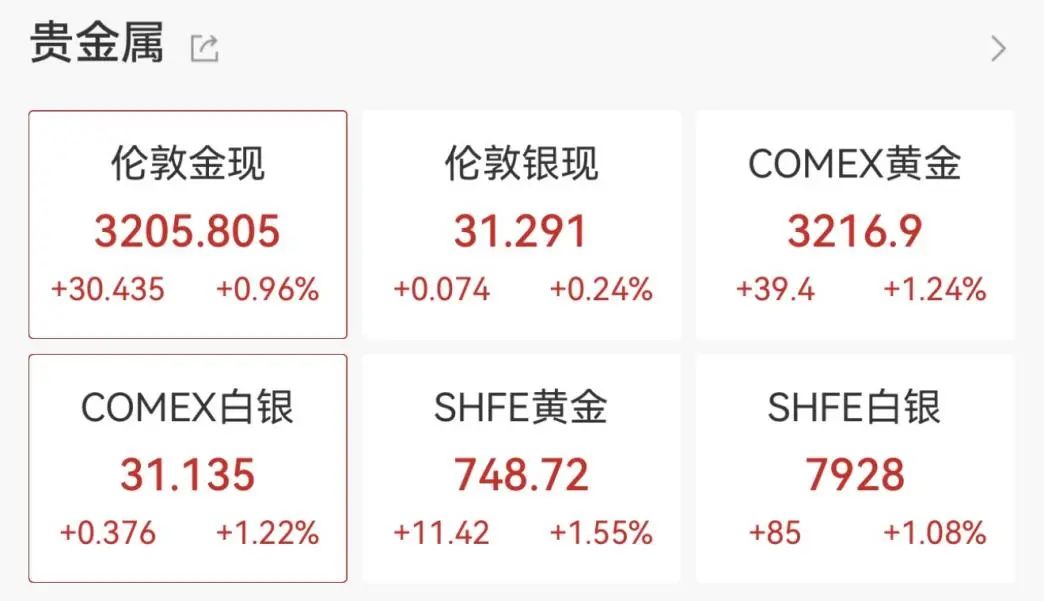 此外,避险情绪升温,现货黄金价格持续走高,现货黄金站上3200美元/盎司,再创历史新高,年内涨超22%。