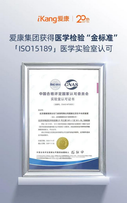 2023年,爱康北京区中央实验室获得中国合格评定国家认可委员会(CNAS)的ISO15189实验室认可,该认可是医学实验室管理水平与技术能力走向规范化、标准化、国际化的重要标志,被誉为行业“金标准”,代表着爱康北京区中央实验室出具的检验报告拥有了“国际通行证”,在全球100多个国家和地区均可得到互认。