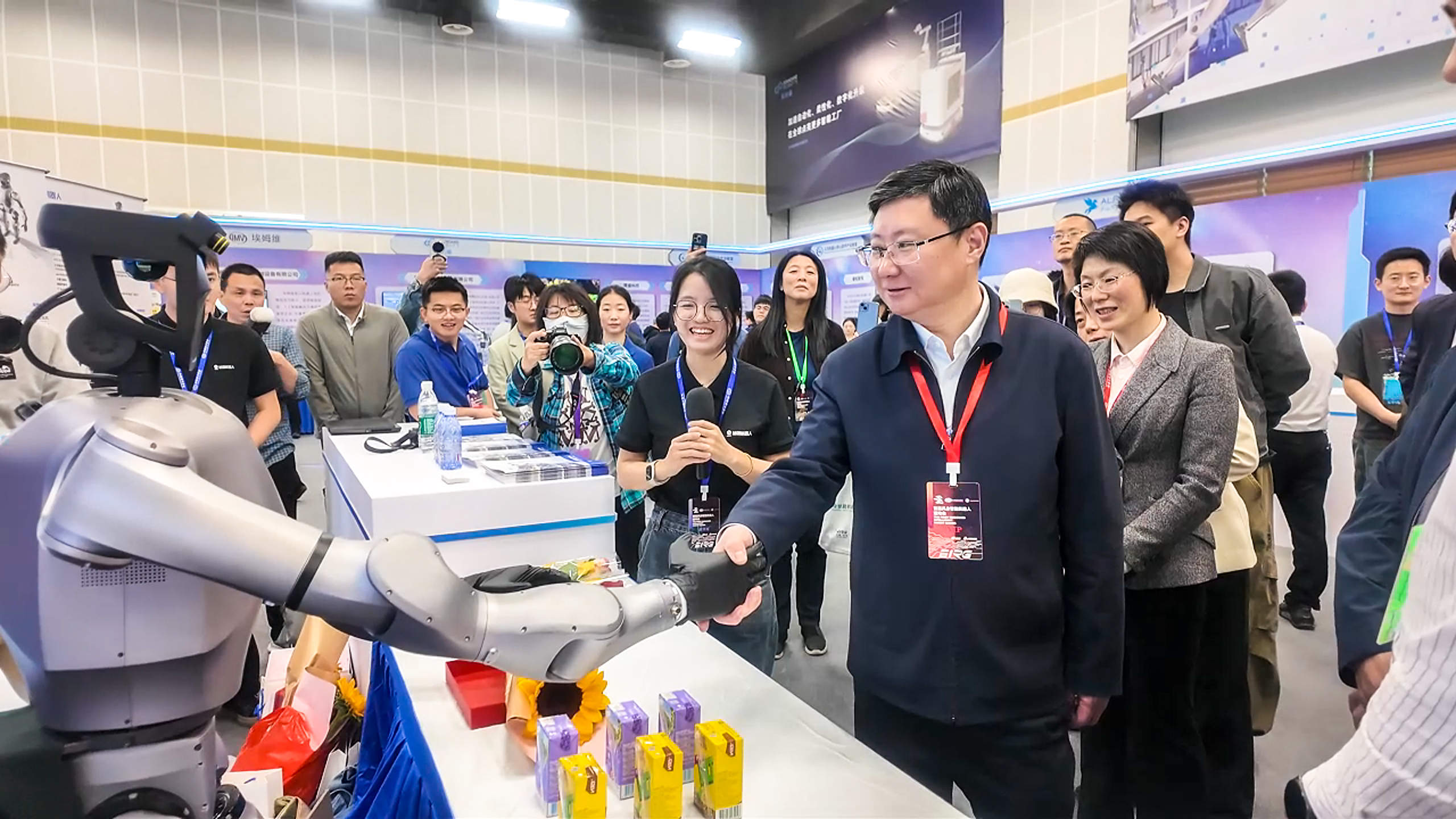 (无锡市副市长周文栋与越疆ATOM握手互动)