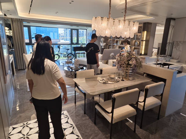 来到上海外环外某新房项目的售楼处,记者看到,尽管临近傍晚,洽谈区仍坐着几组客户,讨论着购房细节。沙盘前,置业顾问正在为几组客户讲解,同时不断有新的看房客踏入大厅。