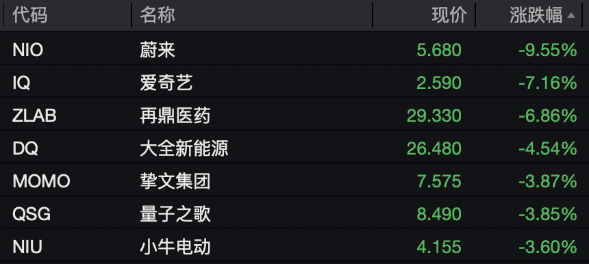 中概股走势偏弱,纳斯达克(NDAQ)中国金龙指数跌超1%。个股方面,百济神州(688235)跌近8%,蔚来(NIO)跌超9%,爱奇艺(IQ)、再鼎医药(ZLAB)跌超6%。