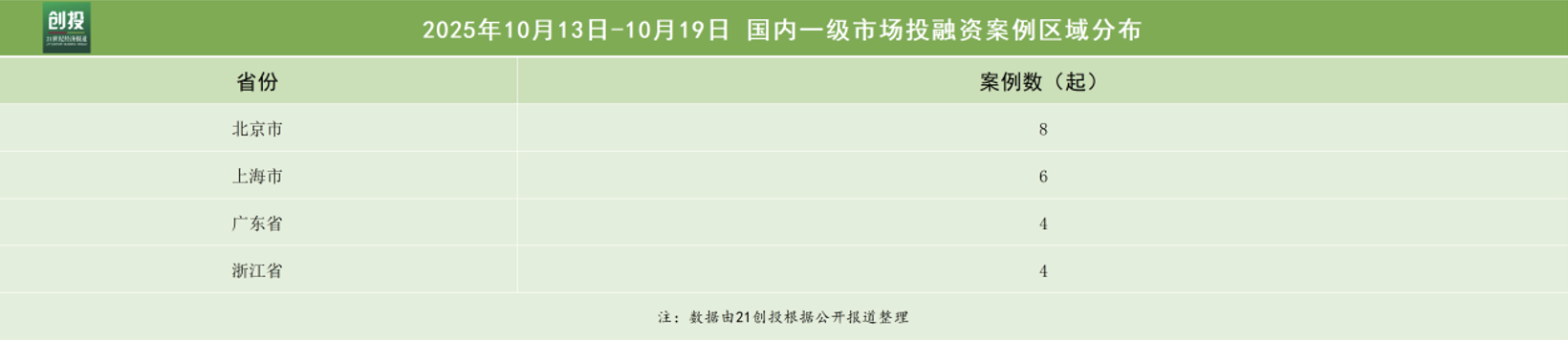 从披露获投企业的地域分布来看,本周的融资地区主要集中在北京市、上海市、广东省和浙江省,分别完成8笔、6笔、4笔和4笔融资。