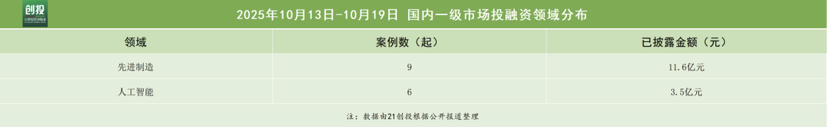 本周融资数量最多的行业领域仍是科技与制造。在三大行业领域的诸多赛道中,先进制造赛道完成9笔融资,融资金额约为11.6亿元人民币;人工智能赛道完成6笔融资,披露融资额约为3.5亿元人民币。