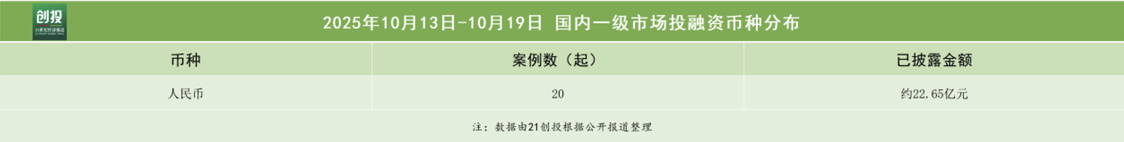21创投不完全统计,10月13日—10月19日,报告日期内国内一级市场发生融资事件29起。其中,有20笔融资披露了融资金额和币种信息,总规模约合人民币22.65亿元人民币。
