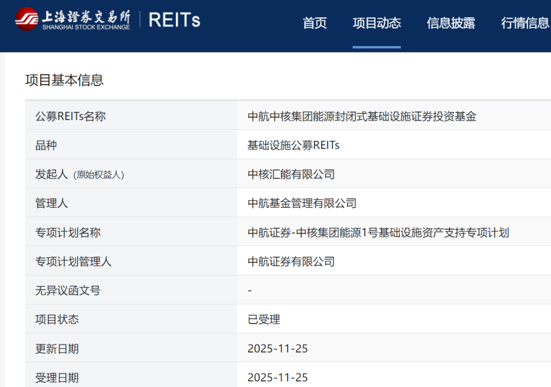 此外,中航中核集团能源公募REIT状态更新为“获受理”。