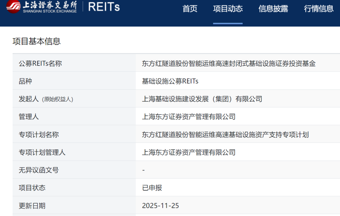 11月25日晚间,上交所网站信息显示,东方红隧道股份(600820)智能运维高速REIT正式申报,为首单隧道公募REITs,也是东方红资产管理旗下首单REITs项目。