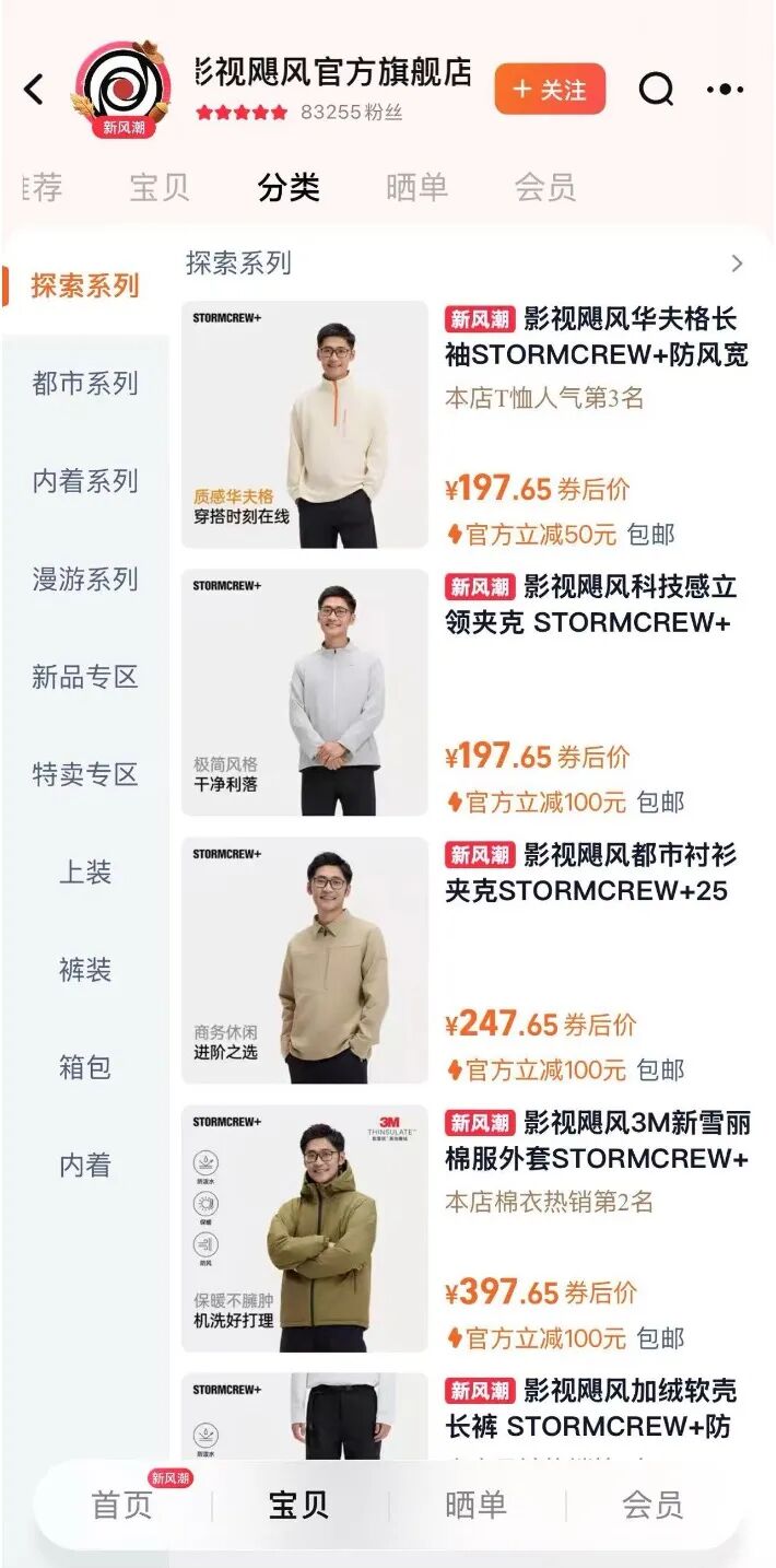 目前,影视飓风旗下服装品牌STORMCREW在抖音、天猫等平台均有官方店铺,售卖产品以服饰内衣为主。从20多块的棒球帽到500多块的冲锋衣,销量都相当可观。前述争议中的三合一冲锋衣(羽绒款)是其近期最热销的产品,单平台显示销量就已经超过万件。
