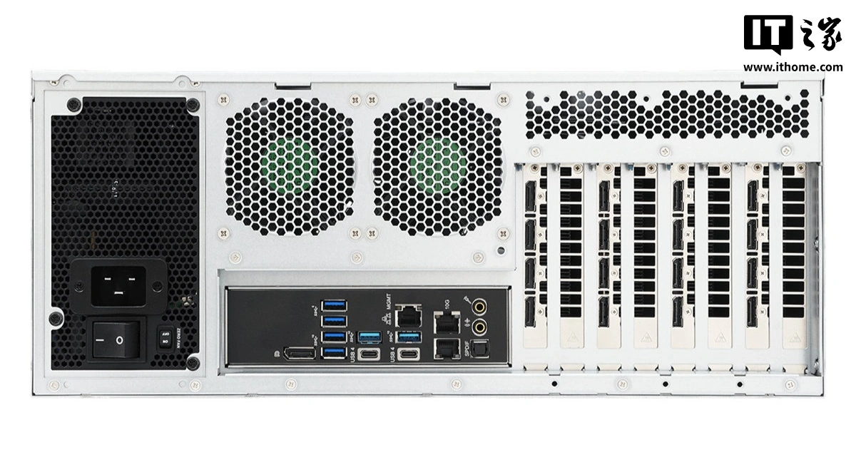 这四张显卡总计可以带来 128GB 显存和 16 个 DisplayPort 2.1a 接口,可以运行部分 AI 大语言模型,主板上的 BMC 管理系统还拥有 DP 1.1a 接口,可远程输出图像。