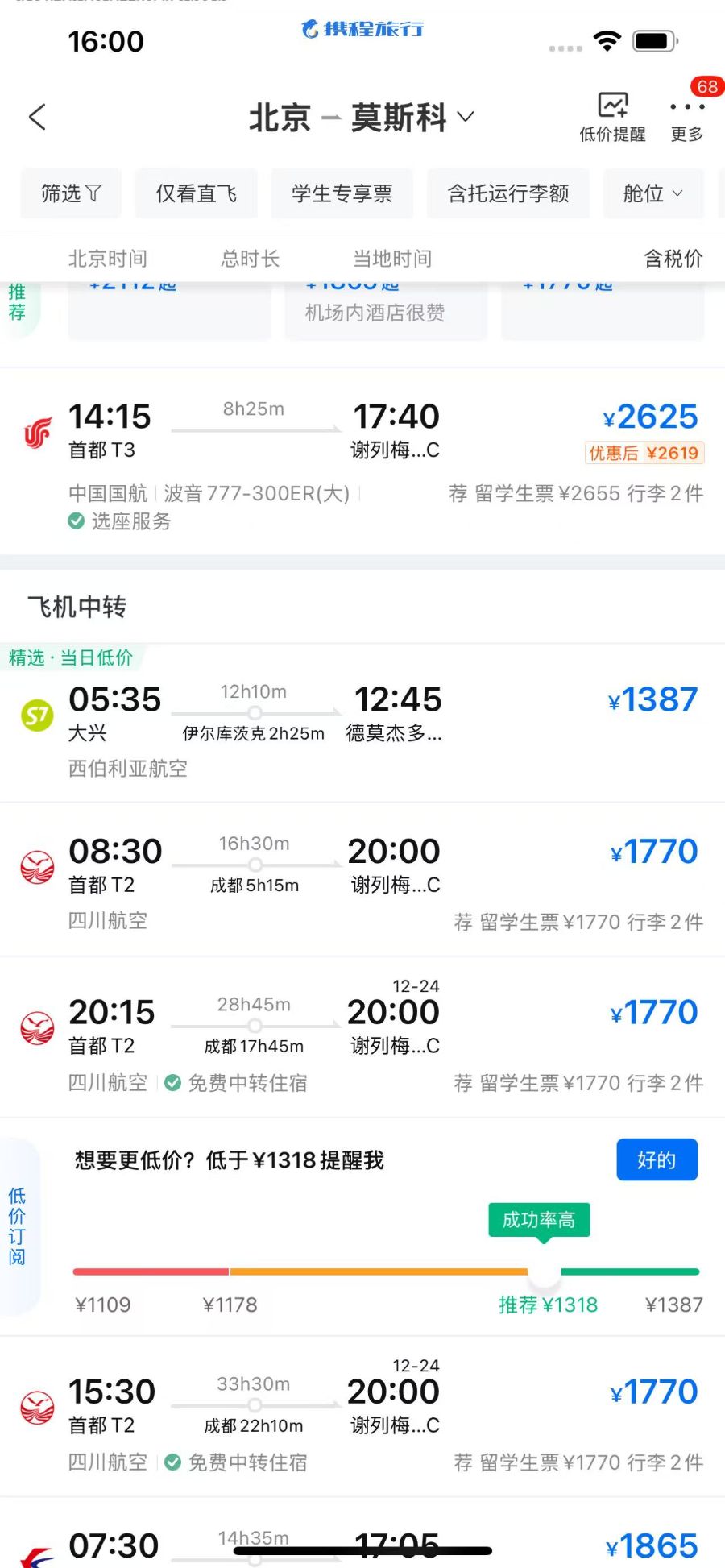 在多个旅行预订平台,记者搜索近期飞俄罗斯的机票,价格颇为实惠。比如圣诞节前从北京飞莫斯科,含税最低价格为1435元,而从广州出发的机票,含税价格最低在1792元。
