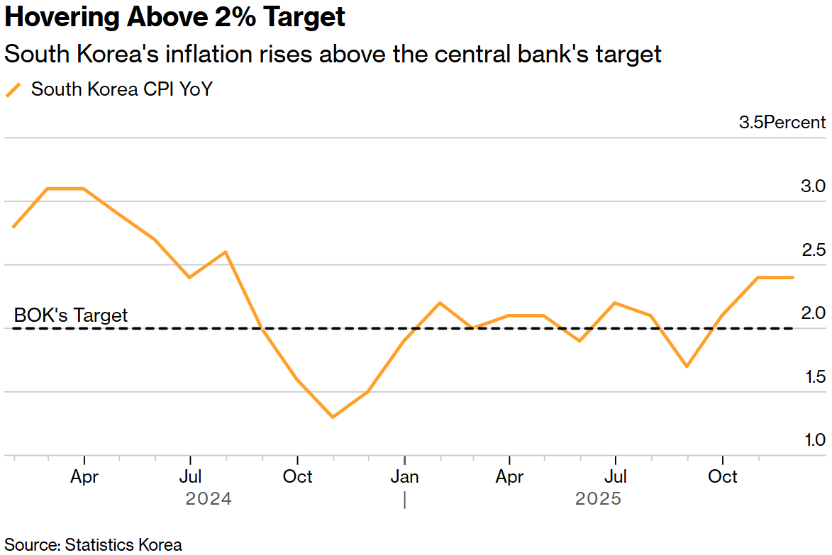 韩国11月通胀2.4%超预期 央行降息恐遥遥无期