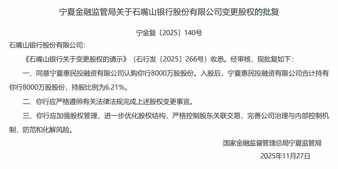 12月1日,国家金融监督管理总局宁夏监管局发布批复,同意宁夏惠民投融资有限公司认购石嘴山银行8000万股股份。入股后,宁夏惠民投融资有限公司合计持有该行8000万股股份,持股比例为6.21%。