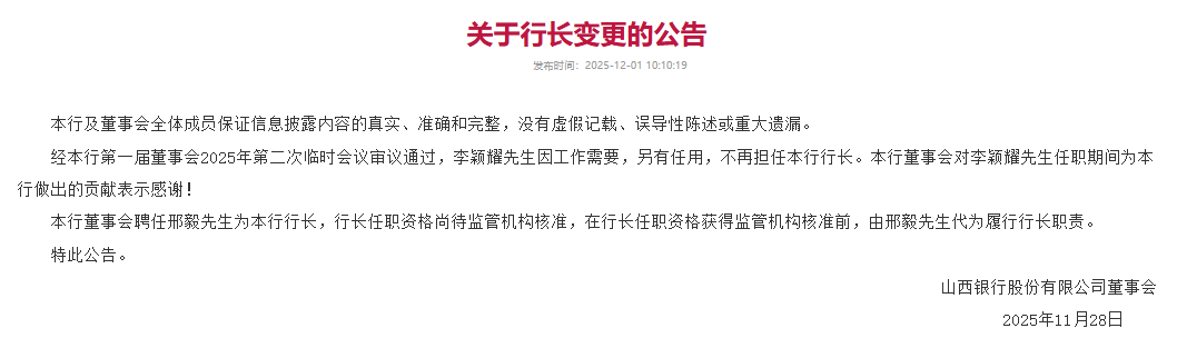 上证报中国证券网讯(记者 黄坤)日前,山西银行发布关于行长变更的公告,经该行第一届董事会2025年第二次临时会议审议通过,李颖耀因工作需要,另有任用,不再担任该行行长。