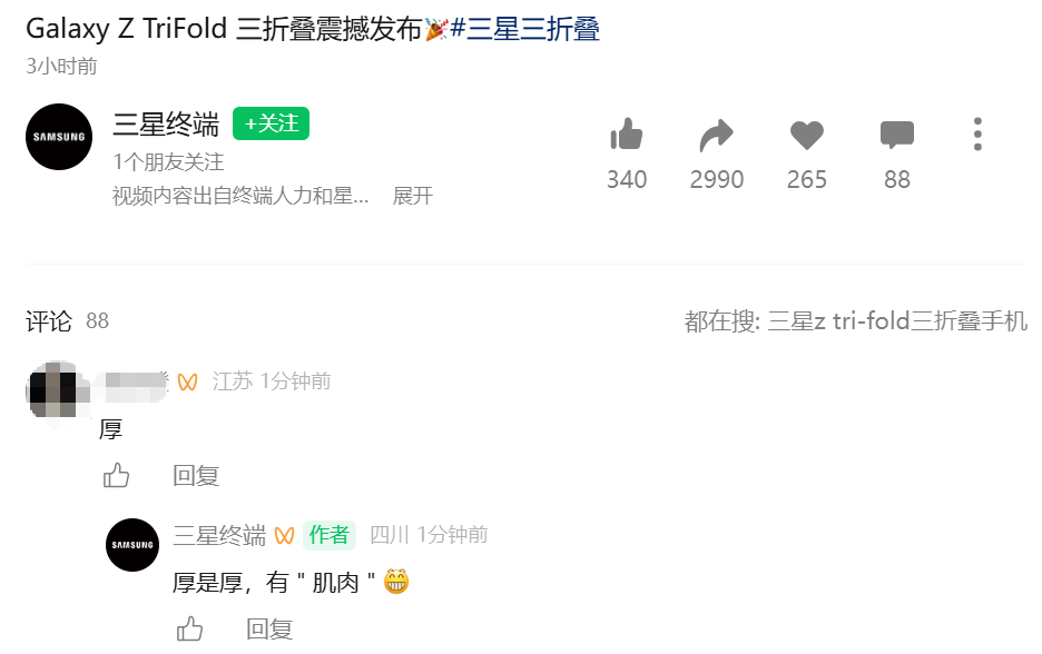 另外,三星Galaxy Z TriFold的折叠方式与华为Mate XT存在区别。Galaxy Z TriFold采用双侧内折铰链设计,而华为Mate XT折叠时呈现Z字形结构。对于网友留言的“厚”,三星终端回复称,“厚是厚,有‘肌肉’”。