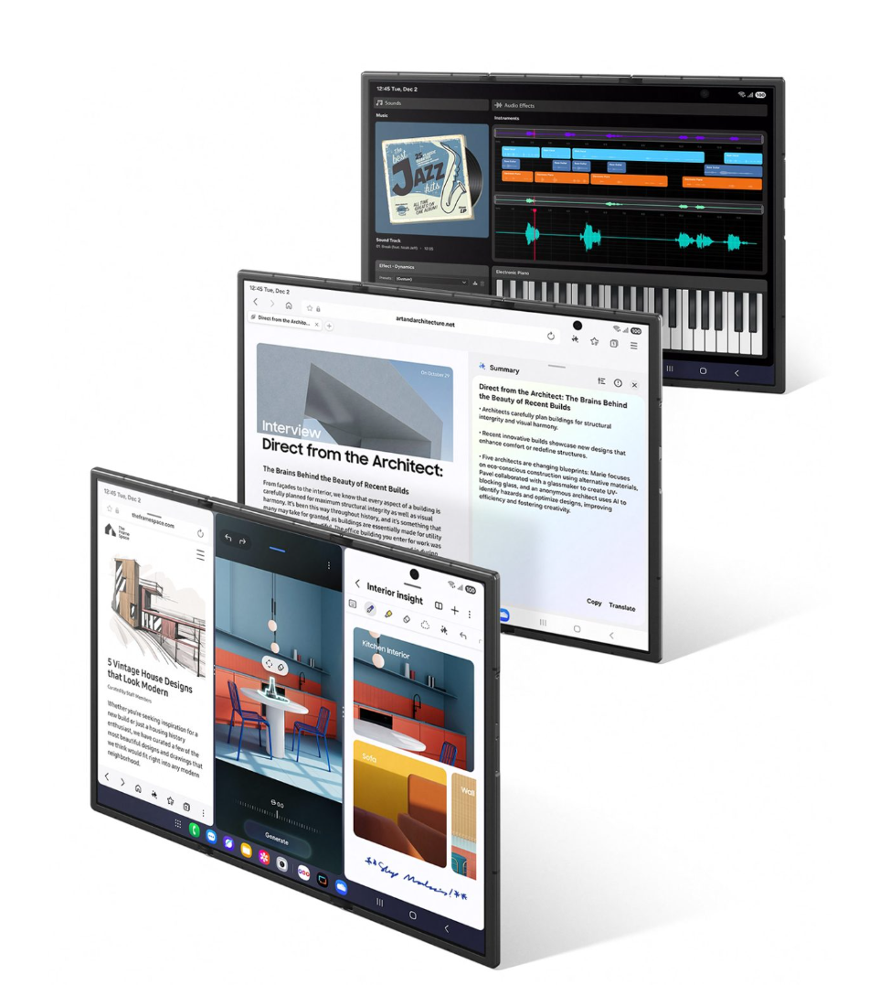 屏幕方面,三星将Galaxy Z TriFold称为“三星最多功能的AI手机,搭载最大屏幕”。当Galaxy Z TriFold打开时,屏幕显示效果类似于三部6.5英寸智能手机在10英寸屏幕上,为用户提供更多任务处理空间。
