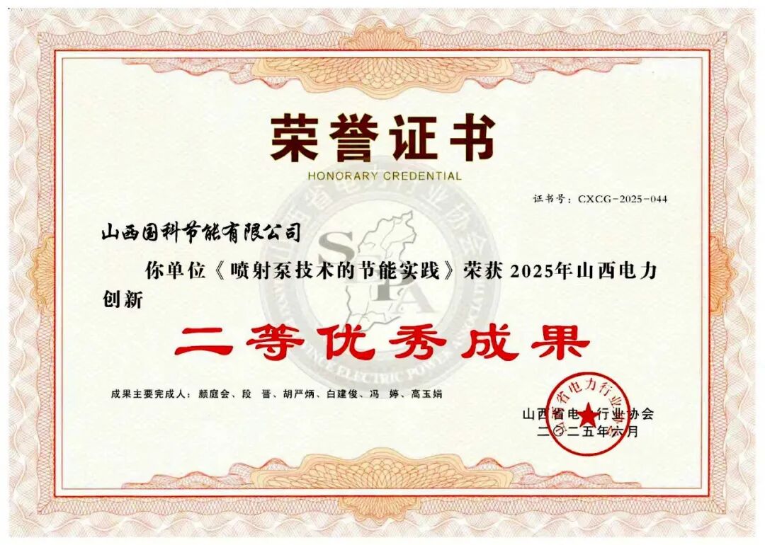 近日,环保工程公司所属的国科节能公司自主研发的“喷射泵技术的节能实践”成果获评2025年山西电力创新“二等优秀成果”。这是国科公司继2023年、2024年之后又一年连续获得山西电力创新成果优秀成果。