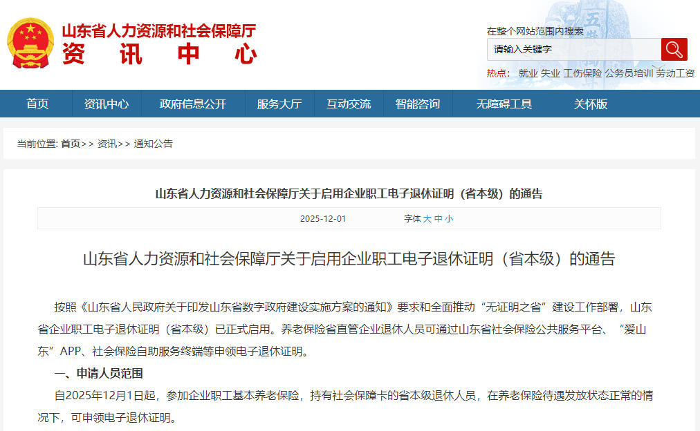 鲁网12月3日讯记者从山东省人力资源和社会保障厅官网获悉,自2025年12月1日起,山东省正式启用企业职工电子退休证明(省本级),养老保险省直管企业退休人员可通过山东省社会保险公共服务平台、“爱山东”APP、社会保险自助服务终端等申领电子退休证明。