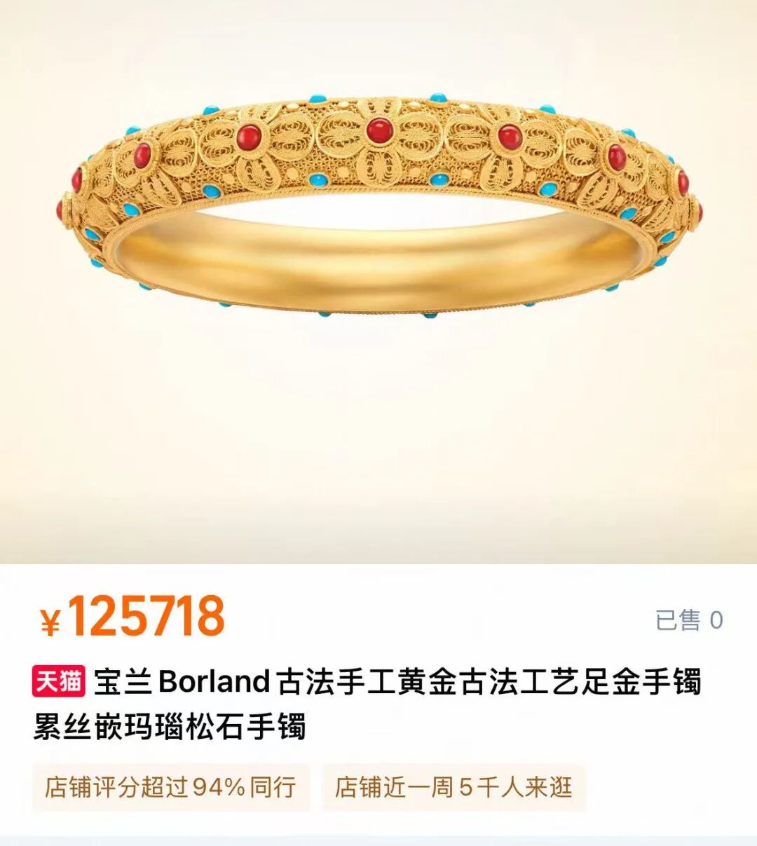 据中新经纬报道,记者查阅发现“寶蘭”天猫旗舰店上,一只约65克重的古法手工黄金工艺累丝嵌玛瑙松石手镯售价达125718元。