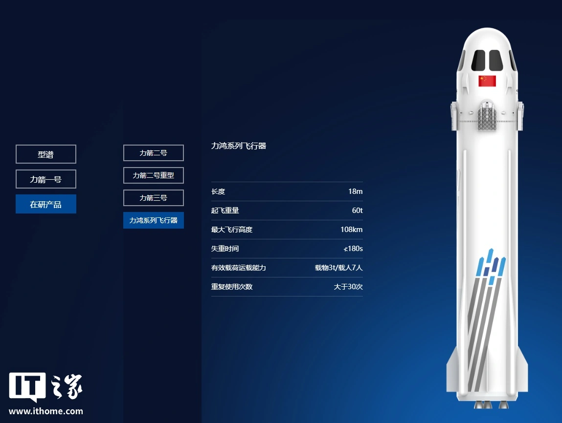 IT之家查询中科宇航官网获悉,力鸿系列飞行器目前为在研产品,长度18m、起飞重量60t、最大飞行高度108km、失重时间≮180s。另外,该系列飞行器的有效载荷运载能力为载物3t/载人7人,支持大于30次的重复使用次数。