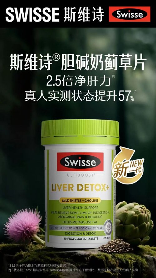 王牌护肝单品——Swisse斯维诗胆碱奶蓟草片,从原料到生产全链路贯彻“三真”原则。产品创新添加了自研组方,相关研究成果刊登于SCI期刊,还通过了1024项检测严控质量,结合动物实验与真人实测,多维度为产品品质夯实基础。