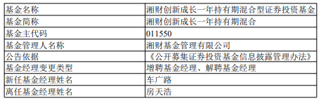 中国经济网北京12月4日讯今日,湘财基金公告,湘财创新成长一年持有期混合增聘车广路,房天浩离任。