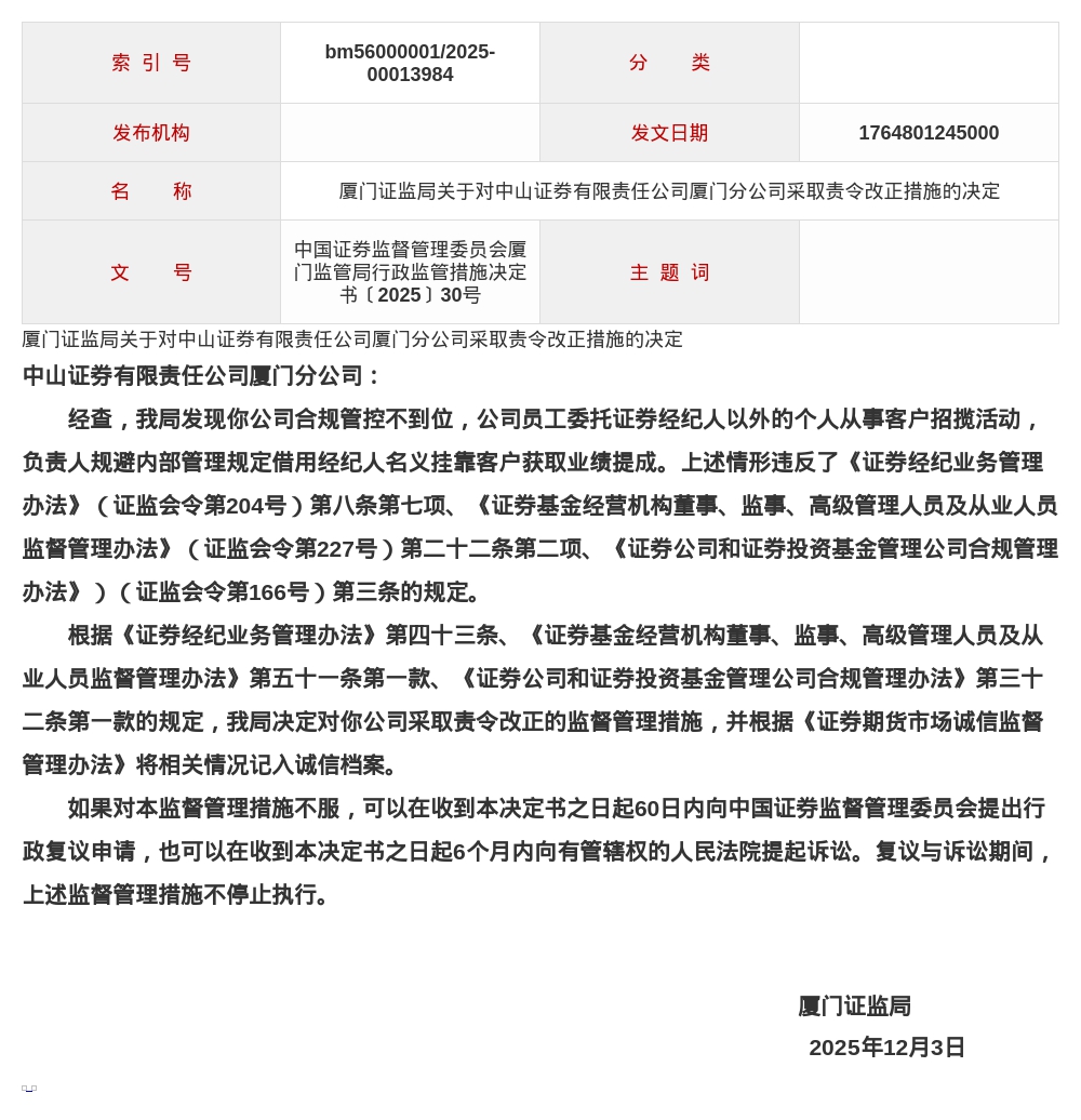 中山证券厦门分公司被责令改正,涉合规管控不到位等