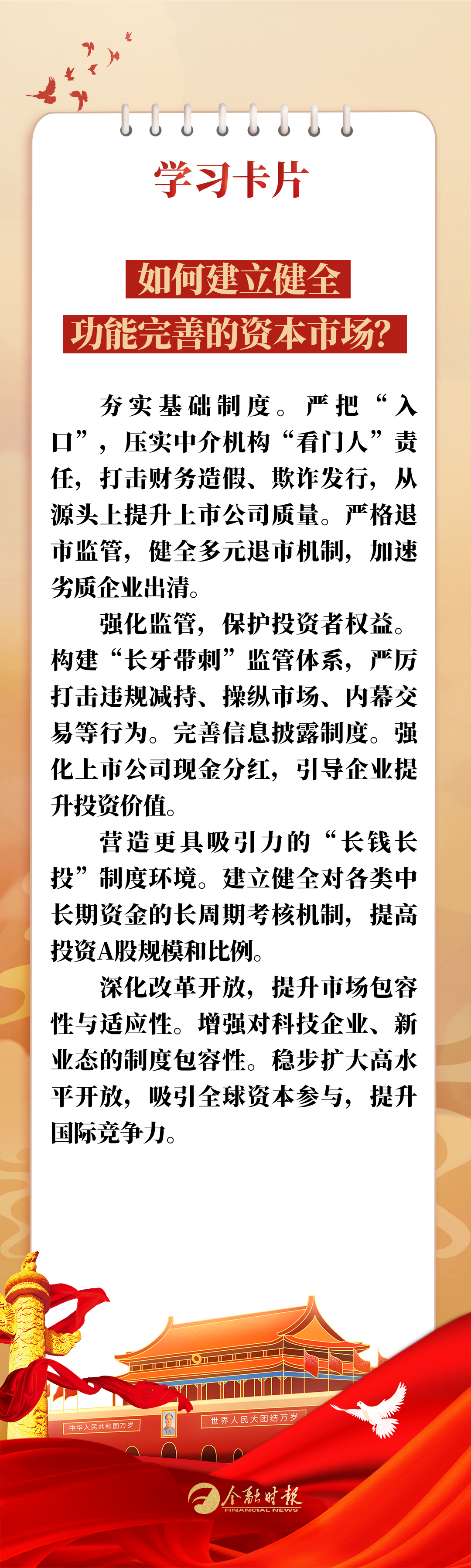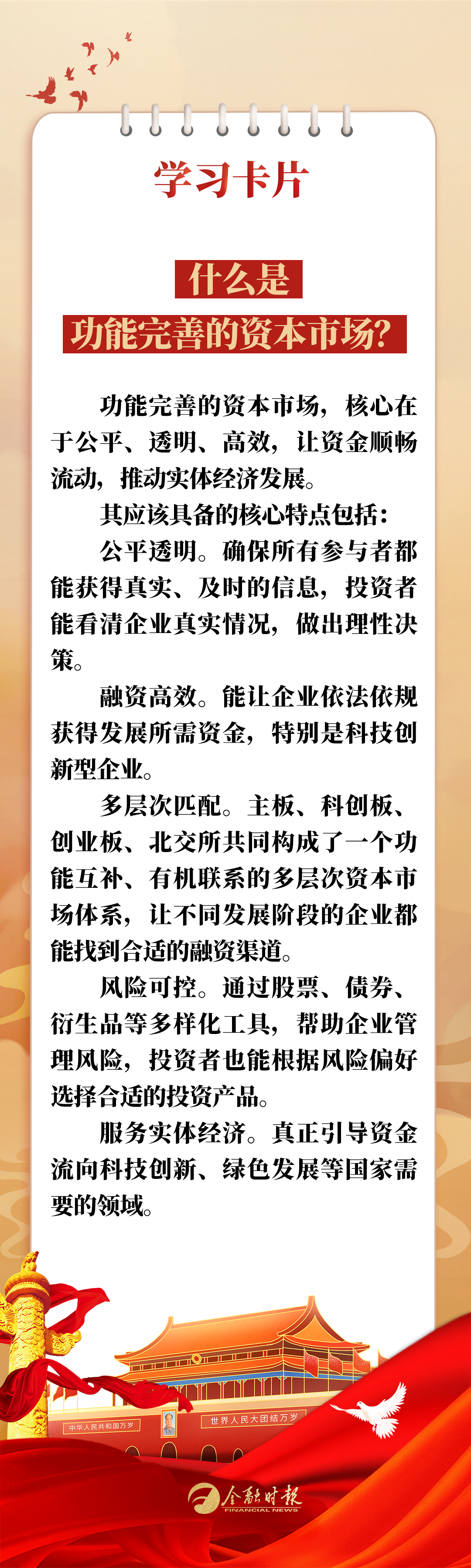 金融时报推出“十五五”规划建议“学习卡片”系列融媒体作品。今日推出第三期《学习卡片|四中全会关键词讲解——什么是功能完善的资本市场?如何建立健全?》。