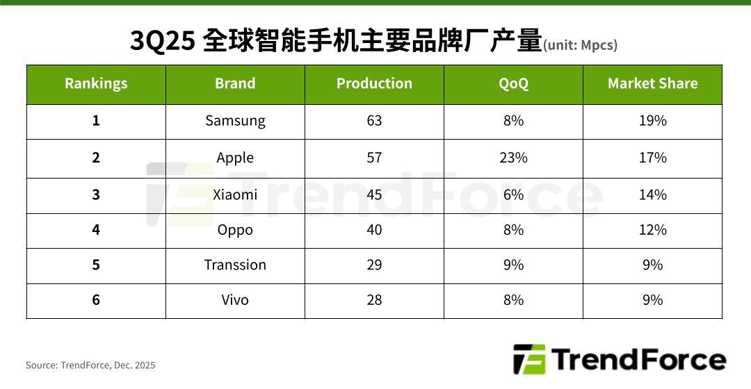 集邦报告 2025Q3 全球手机产量:三星环比增 8%、苹果增 23%、小米增 6%、OPPO 增 8%、传音增 9%、vivo 增 8%