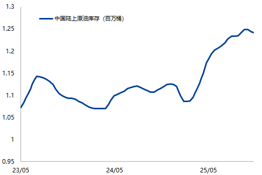 中国方面,2025年中国原油需求增长主要由石化工原料(石脑油、NGLs/LPG)及航空煤油推动。表外需求来看,据S&P数据,2025年以来陆上原油库存以约60万桶/日的速度累积,战略储备补充自3月起明显加快。考虑到能源安全战略及现有库容宽松(据据Rystad Energy分析,库容使用率约60%,2025年底前还将新增1.24亿桶能力),中国战略补库需求有望延续。