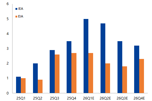 图表2:预计2026Q1供需过剩量达到最大(百万桶/天)