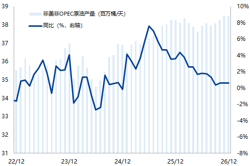 综合评估供应端情况,OPEC+在快速回补减产后,进一步增产空间与闲置产能均有限,且财政诉求支撑油价。美国页岩油受成本上升与资本开支约束,增长乏力。非美非OPEC供应增速持续放缓。叠加地缘风险延续,全球供应增长边际放缓趋势明确,预计2026年一季度过剩压力达峰后,供应侧压力将逐步缓解。
