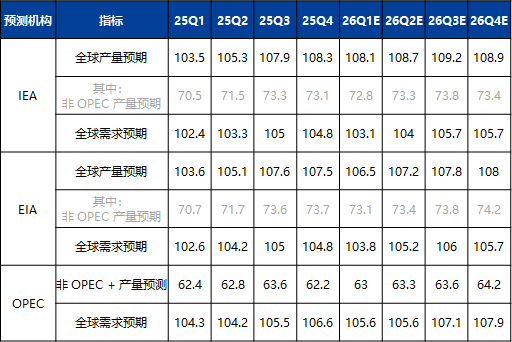 根据三大主流机构国际能源署(IEA)、美国能源信息署(EIA)、石油输出国组织(OPEC)对2025至2026年的全球原油供需平衡预测情况看,全球原油市场正处于阶段性宽松周期,主要原因在于2025年OPEC+对2022年以来减产计划的快速回补,使供应增速超过需求,从而导致供需平衡转向宽松。而随着过剩趋势的惯性延续,全球原油供需过剩的压力预计将在2026年第一季度达到峰值。此后,随着市场再平衡,过剩程度有望开始边际放缓。