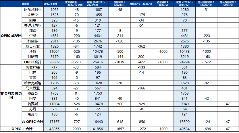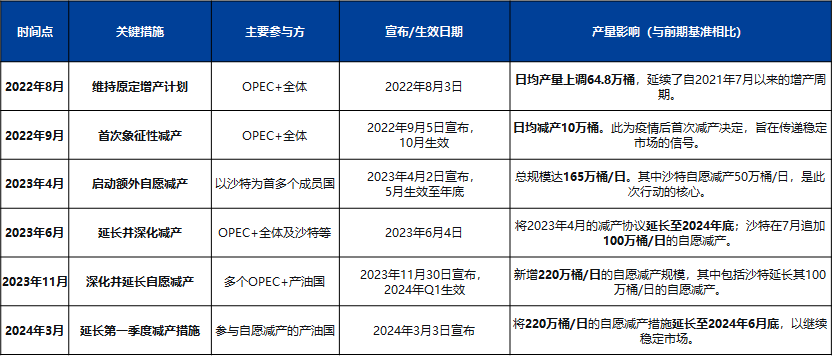 梳理2022年8月至2024年3月OPEC减产政策,2022年最初是象征性减产(10万桶/日),主要目的是向市场释放OPEC+有意愿干预以稳定油价的信号。2023年开始,随着对经济放缓和需求疲软的担忧加剧,减产规模大幅提升至百万桶级别,转为实质性干预。2023年底以来,OPEC+的减产多以自愿减产形式宣布。