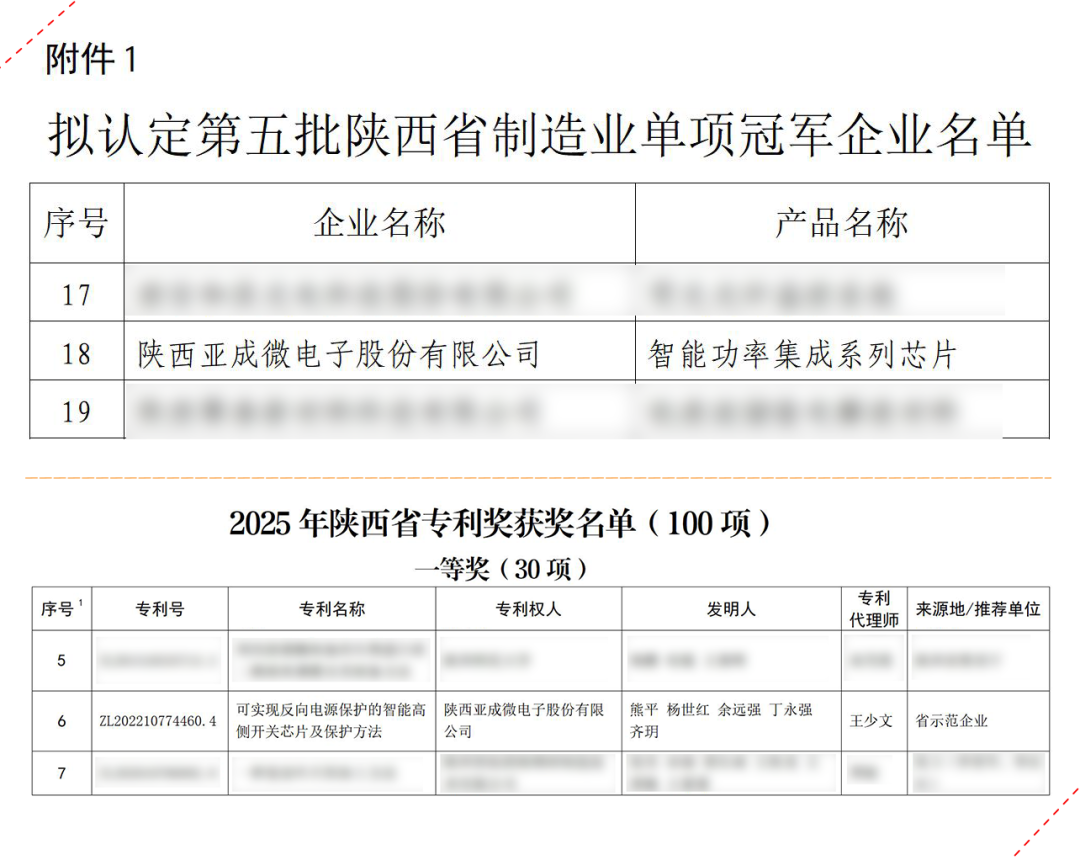 近日,亚成微凭借在智能功率集成技术领域的卓越表现,荣膺“第五批陕西省制造业单项冠军企业”称号。与此同时,其“可实现反向电源保护的智能高侧开关芯片及保护方法”专利技术,荣获陕西省专利奖一等奖。